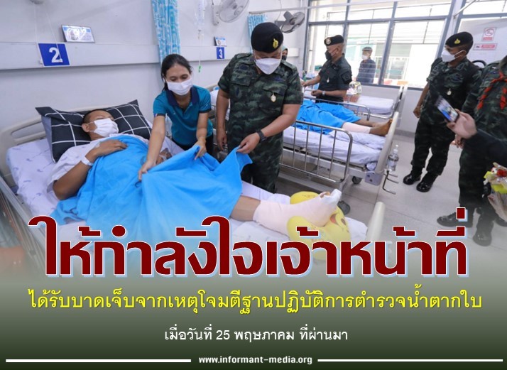 ? แม่ทัพภาคที่ 4 เยี่ยมให้กำลังใจเจ้าหน้าที่ ที่ได้รับบาดเจ็บจากเหตุโจมตีฐานปฏิบัติการตำรวจน้ำตากใบ นราธิวาส เมื่อวันที่ 25 พฤษภาคม ที่ผ่านมา เร่งรวบรวมหลักฐานติดตามผู้ก่อเหตุมาดำเนินคดีโดยเร็ว?