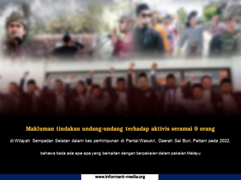 Makluman tindakan undang-undang terhadap aktivis seramai 9 orang di Wilayah Sempadan Selatan dalam kes perhimpunan di Pantai Wasukri, Daerah Sai Buri, Pattani pada 2022, bahawa tiada ada apa-apa yang berkaitan dengan berpakaian dalam pakaian Melayu seperti yang dikomunikasikan untuk mewujudkan salah faham di dalam dunia online, tetapi ia kerana ada peserta yang menganjurkan aktiviti dengan aktiviti yang haram pada undang-undang. Dan mengesahkan bahawa pemakaian pakaian Melayu