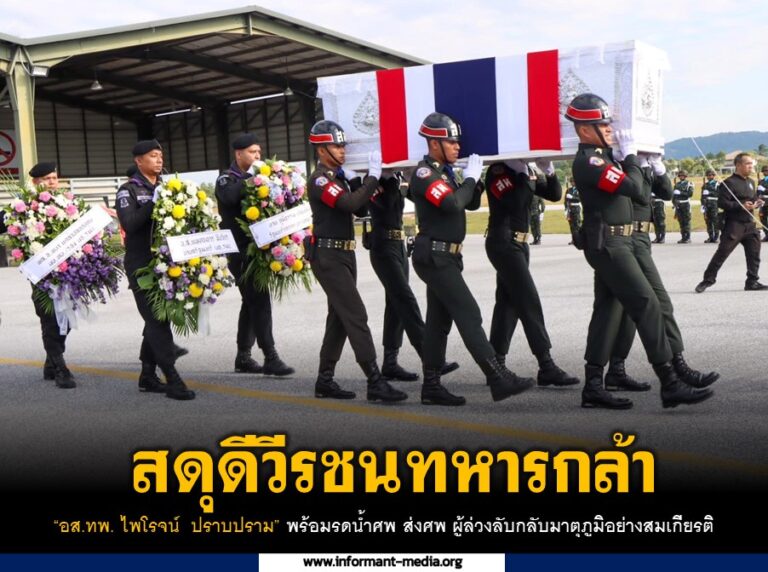 สดุดีวีรชนทหารกล้า “อส.ทพ. ไพโรจน์ ปราบปราม” พร้อมรดน้ำศพ ส่งศพ ผู้ล่วงลับกลับมาตุภูมิอย่างสมเกียรติ