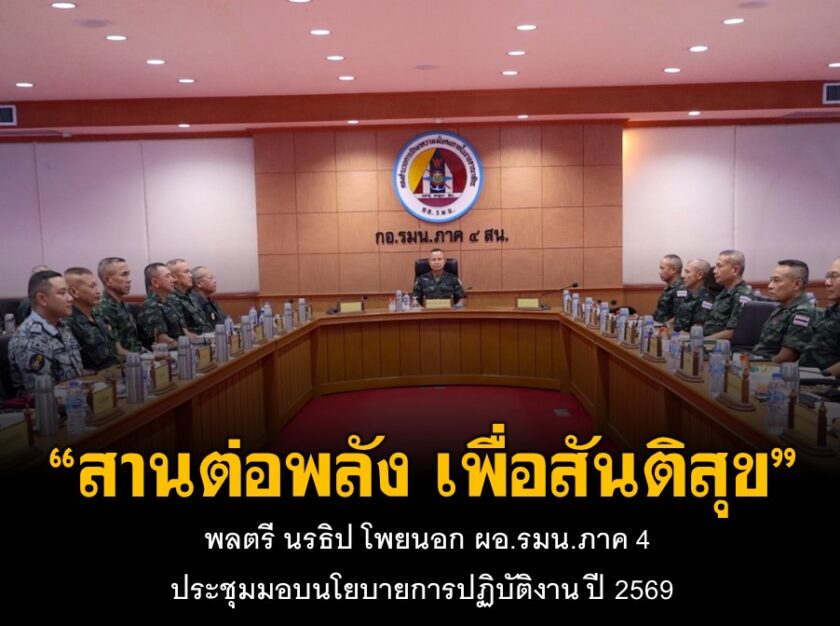 หลังจากที่มีการส่งต่อตำแหน่งผู้อำนวยการรักษาความมั่นคงภายในภาค 4 ระหว่าง พลโท ไพศาล หนูสังข์ (ท่านเก่า) กับ พลตรี นรธิป โพยนอก (ท่านใหม่) เมื่อช่วงสายของวันนี้ (30 กันยายน 2568) ต่อมาเวลา 13.45 น. ที่ ห้องประชุม 1 กองอำนวยการรักษาความมั่นคงภายในภาค 4 ส่วนหน้า ค่ายสิรินธร ตำบลเขาตูม อำเภอยะรัง จังหวัดปัตตานี พลตรี นรธิป โพยนอก ผู้อำนวยการรักษาความมั่นคงภายในภาค 4 เป็นประธานการประชุมมอบนโยบายการปฏิบัติงาน ประจำปี 2569 เพื่อกำหนดทิศทางการทำงาน สานต่อนโยบายเพื่อสันติสุข เสริมสร้างความต่อเนื่อง และขับเคลื่อนภารกิจด้านความมั่นคงตลอดจนการพัฒนาทุกมิติในพื้นที่จังหวัดชายแดนภาคใต้ โดยมีพี่น้องประชาชนเป็นศูนย์กลางของการพัฒนา