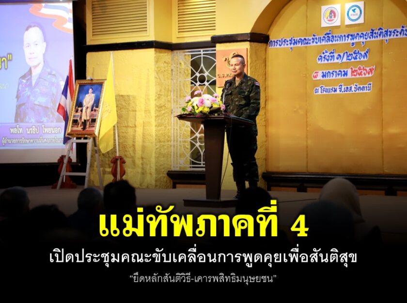 เมื่อวันที่ 8 มกราคม 2569 ณ โรงแรมซี.เอส. ปัตตานี พลโท นรธิป โพยนอก แม่ทัพภาคที่ 4 ในฐานะผู้อำนวยการรักษาความมั่นคงภายในภาค 4 เป็นประธานเปิดการประชุมคณะขับเคลื่อนการพูดคุยเพื่อสันติสุขระดับพื้นที่ (คพท.) ครั้งที่ 1 ประจำปี 2569 โดยมี พลตรีชาคริต อุจะรัตน รองแม่ทัพภาคที่4 , นางพาตีเมาะ สะดียามู ผู้ว่าราชการจังหวัดปัตตานี , พันเอก อุทัย รุ่งสังข์ รองผู้อำนวยการศูนย์สันติวิธี , พันเอก สรรัศมิ์ นิลสลับ รองผู้บังคับการกองกำลังทหารพรานจังหวัดชายแดนภาคใต้ , พันตำรวจเอกสนธยา ธูปทอง รองผู้บังคับการตำรวจภูธรจังหวัดปัตตานี และผู้แทนจากหน่วยงานรัฐ ผู้นำศาสนา ผู้นำท้องถิ่น และภาคประชาชนเข้าร่วมอย่างคับคั่ง โดยในการประชุมได้มีการกล่าวถึง การมุ่งเน้นยุทธศาสตร์สร้างสภาวะแวดล้อมที่เอื้อต่อการดับไฟใต้ด้วยแนวทางสันติวิธีอย่างยั่งยืน