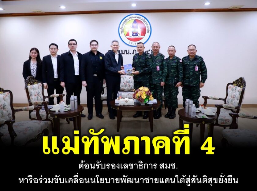 วันที่ 11 กุมภาพันธ์ 2569 เวลา 15.00 น. ที่ห้องรับรอง กองอำนวยการรักษาความมั่นคงภายในภาค 4 ส่วนหน้า ค่ายสิรินธร อำเภอยะรัง จังหวัดปัตตานี พลโท นรธิป โพยนอก แม่ทัพภาคที่ 4 / ผู้อำนวยการรักษาความมั่นคงภายในภาค 4 พร้อมคณะ ให้การต้อนรับ นายสรพงค์ ศรียานงค์ รองเลขาธิการสภาความมั่นคงแห่งชาติ ในโอกาสเดินทางเข้าพบหารือข้อราชการ โดยมี พลตรี ชาคริต อุจะรัตน รองแม่ทัพภาคที่ 4 / รองผู้อำนวยการรักษาความมั่นคงภายในภาค 4 ส่วนหน้า, พลตรี กรกฎ ภู่โชติ รองแม่ทัพภาคที่ 4 / รองผู้อำนวยการรักษาความมั่นคงภายในภาค 4 ส่วนหน้า คณะผู้บังคับบัญชา กองอำนวยการรักษาความมั่นคงภายในภาค 4 ส่วนหน้า ตลอดจนเจ้าหน้าที่สภาความมั่นคงแห่งชาติ เข้าร่วมประชุม